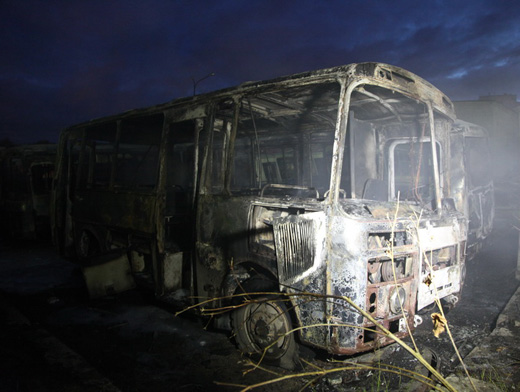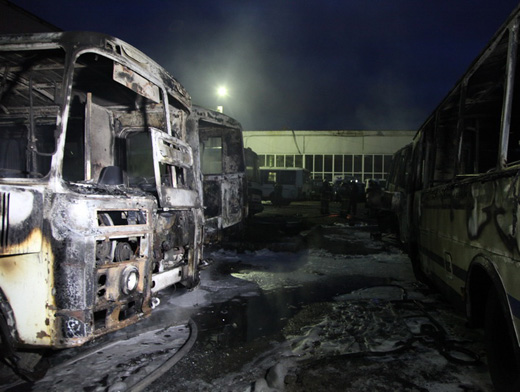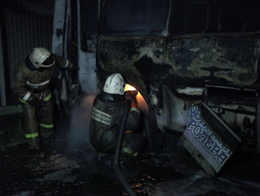 К прибытию пожарных пламя охватило еще 4 «ПАЗика», так как все они стояли друг к другу вплотную. Тушение осложнялось и тем, что автобусы были оснащены газовыми установками.