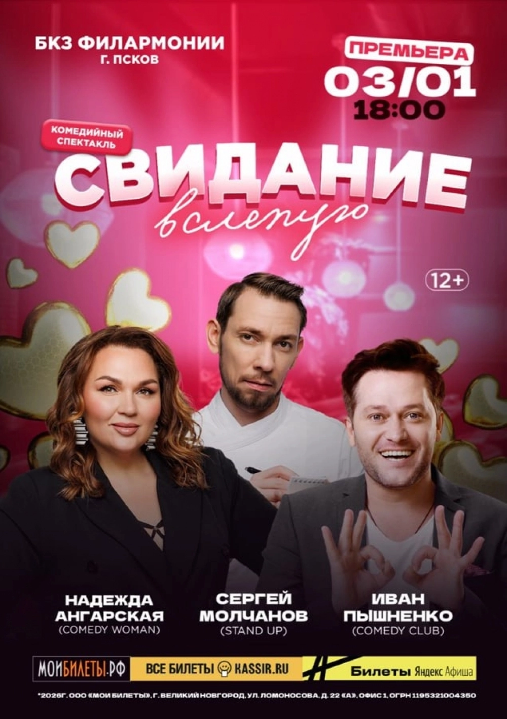 Спектакль «Свидания вслепую». Время: 18:00. Два человека в разводе. У неё ребенок от первого брака и куча комплексов. У него долги за прогоревший бизнес и неуверенность в себе. Что может объединить этих людей, кроме того факта, что оба поставили не свою фотографию на сайте знакомств?