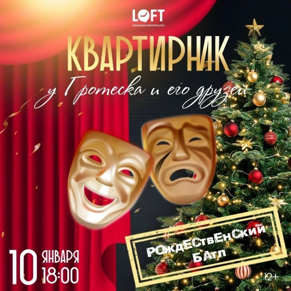 Рождественский квартирник-батл Молодёжного театра «Гротеск». Время: 18:00. Рождественский концерт, а точнее квартирник Молодёжного театра «Гротеск» и друзей артистов из Санкт-Петербурга.