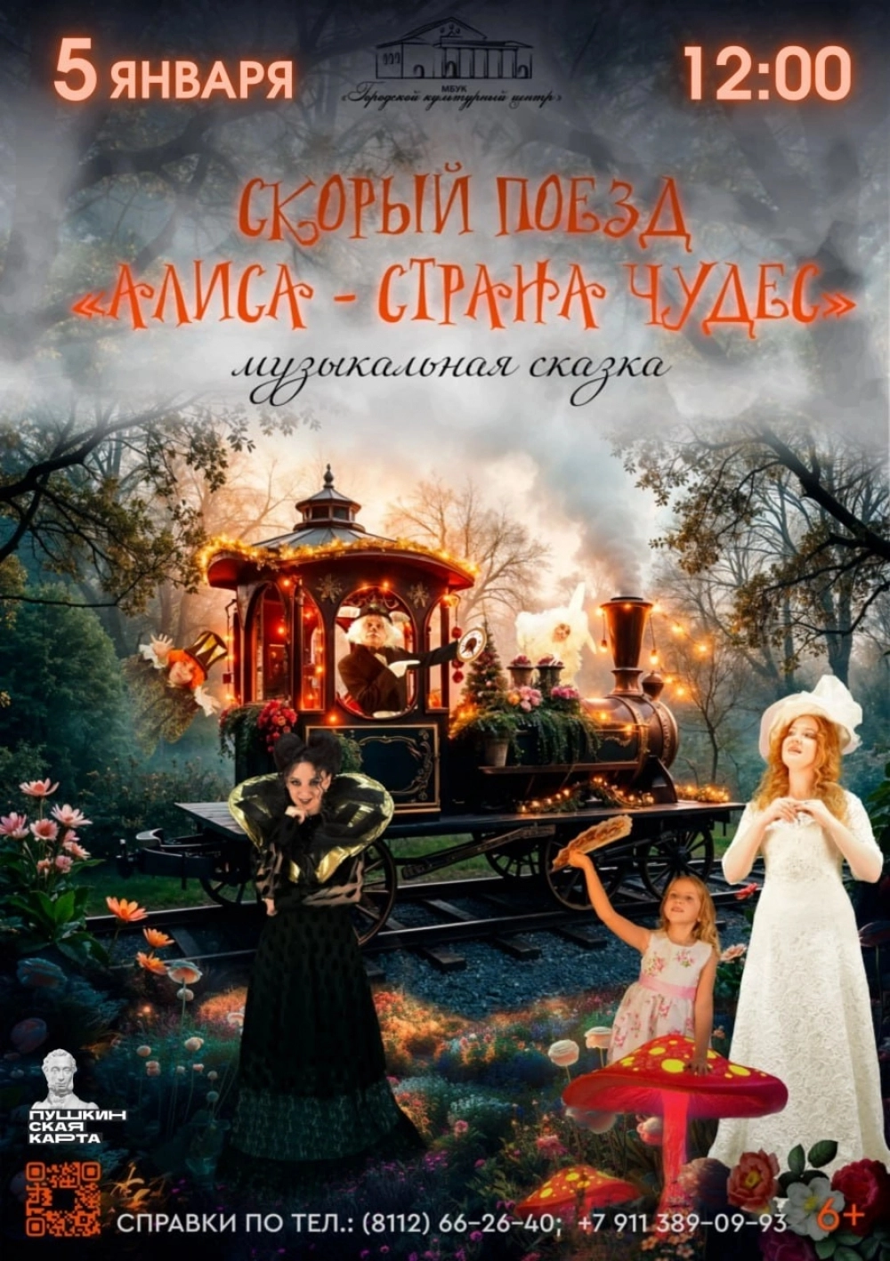 Музыкальный спектакль «Скорый поезд «Алиса – Страна чудес». Время: 12:00. В постановке рассказывается о приключениях маленькой девочки, оказавшейся в вымышленном мире В сказке примут участие вокальная студия «Город детства» и ансамбль эстрадного танца «СувенирБит».