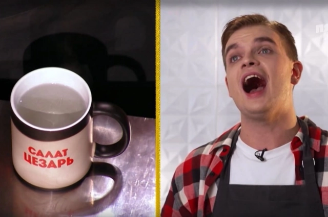 Он призвал участника сначала проверить, работает ли термометр. Владислав сразу же снял крем-брюле с водяной бани, а после начал наливать кипяток в кружку. В этот момент черный цвет кружки сменился на белый. На ней была надпись «Салат Цезарь».