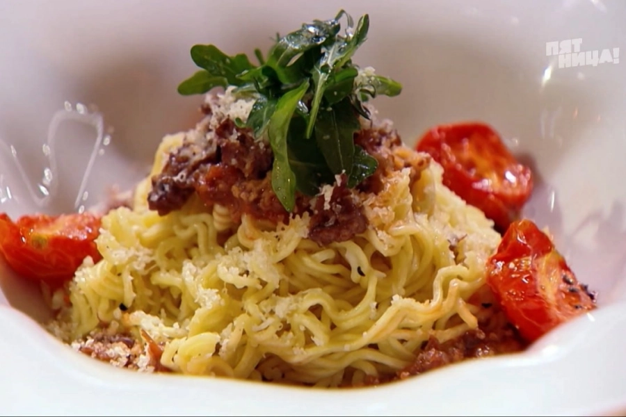 В его наборе оказались тушёнка, лапша быстрого приготовления, томаты в собственном соку и приправа «хмели-сунели». Парень решил приготовить адаптацию на болоньезе. «Выложил начиночку прекрасную, скрученную пасту в оливковом масле, рукколой украсил. Все сделал шик-блеск», – прокомментировал он процесс приготовления.