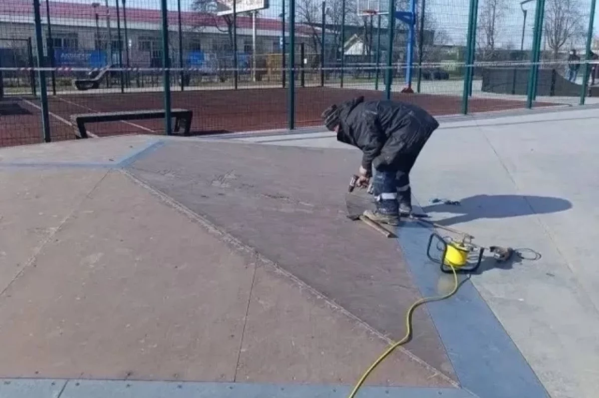 В скейт-парке на улице Леона Поземского специалисты устраняют дефекты. Они ликвидируют неровности, появившиеся после прошлого сезона. Борис Елкин пояснил, что работы проводятся в рамках гарантийного ремонта.