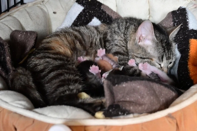 Кошка с раздутым животом оказалась беременной. Почувствовав себя в безопасности, она окотилась: родились четыре котёнка — два самца и две самки серо-рыжего окраса.