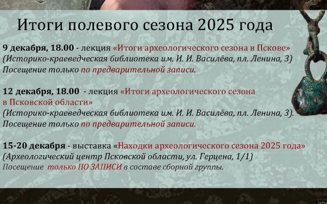 9 декабря в 18:00 пройдет лекция, посвященная итогам археологических работ в Пскове, а 12 декабря в 18:00 - итогам работ в Псковской области.